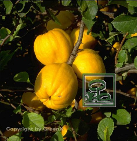 Frucht flachkugelige gefurchte Apfelfrucht; stark aromatisch duftend; lange haftend, bis in den Winter; quittenähnlich, großfrüchtig, bis 6cm dick, reichfruchtend
