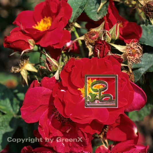 Blüte: dunkelrot, Staubgefäße gelb, schalenförmig, halbgefüllt