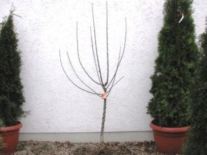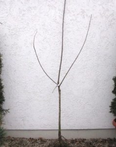 Die Krone muss mindestens drei stark entwickelte, aus zwei Veredelungsstellen entspringende Triebe haben.