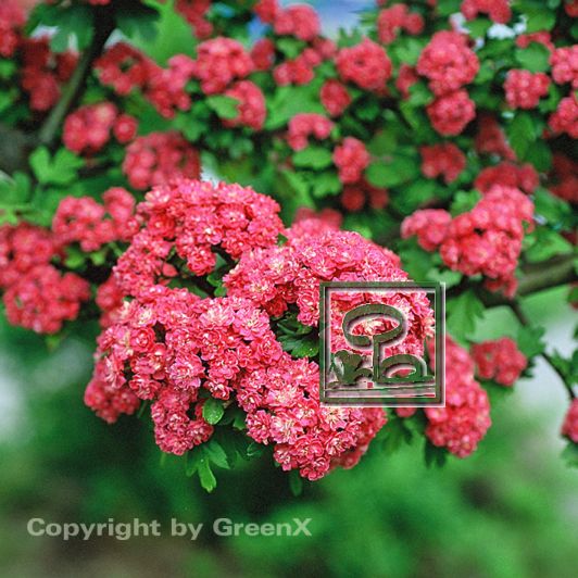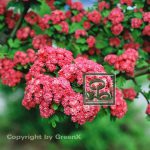 Blüte: leuchtend karminrot, rosettig, in reichblütigen, großen Schirmrispen, gefüllt