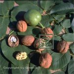 | Frucht | ovale Steinfrucht; groß, bis ca. 4,5cm lang, mit mittelmäßig dicker, glatter fleischiger Schale; Nuß runzelig, stark ölhaltig, vollkernig |