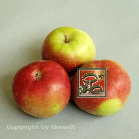 Frucht flach kugelige Apflefrucht; mittelgroßfrüchtig; Fruchtfleisch weiß, saftig, knackig, süßlich, ausgeprägtes Aroma
