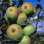 | Frucht | flach kugelige Apfelfrucht; großfrüchtig, gerippt; wachsig, grünweißes, saftiges Fleisch, Geschmack säuerlich, wenig aromatisch |