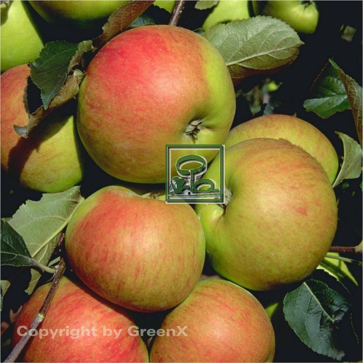 | Frucht | flach kugelige Apfelfrucht; großfrüchtig; Fruchtfleisch süß-säuerlich und aromatisch |