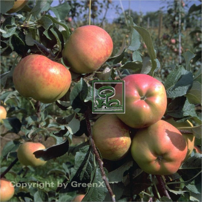 | Frucht | sehr flach kugelige Apfelfrucht; mittel bis großfrüchtig, stark gerippt; Fruchtfleisch cremefarben, mittelfest, saftig, feinzellig,süß mit leichter Säure und sortentypischem Aroma |