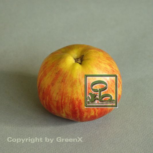 | Frucht | hochgebaute bis kugelige Apfelfrucht; klein bis mittelgroßfrüchtig; Schale glatt, fettig; Fleisch gelblichweiß, locker, saftig, Geschmack angenehm süßsäuerlich |