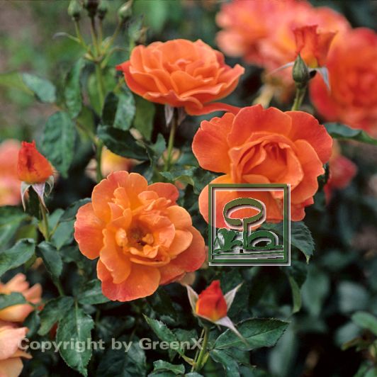 | Blüte: | leuchtend orangerot, rosettig bis schalenförmig, halbgefüllt, mittelgroß |