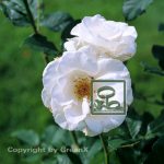 Blüte: perlweiß, im Aufblühen hellrosa überhaucht, rosettig, gefüllt, edelrosenartig, mittelgroß