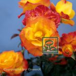 | Blüte: | goldgelb, breit leuchtend orangerot gerandet, rosettig, gefüllt, mittelgroß, edelrosenartig |