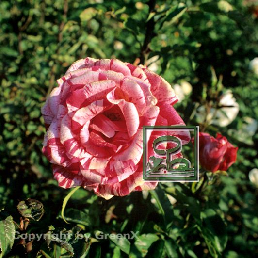 | Blüte: | dunkelrot, unregelmäßig weiß gestreift, rosettig, gefüllt, großblütig, edelrosenartig |