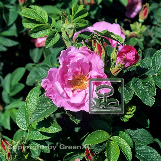 Blüte: violettrosa, Staubgefäße gelb, schalenförmig, halbgefüllt