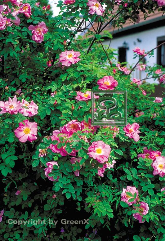 | Blüte: | karminrosa, mit heller Mitte, schalenförmig, einfach bis halbgefüllt |