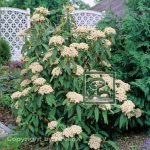 | Blüte: | cremeweiß, stieltellerförmig, in dichten flachen Schirmrispen |